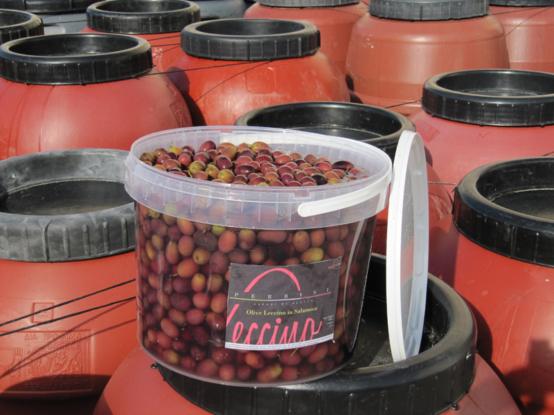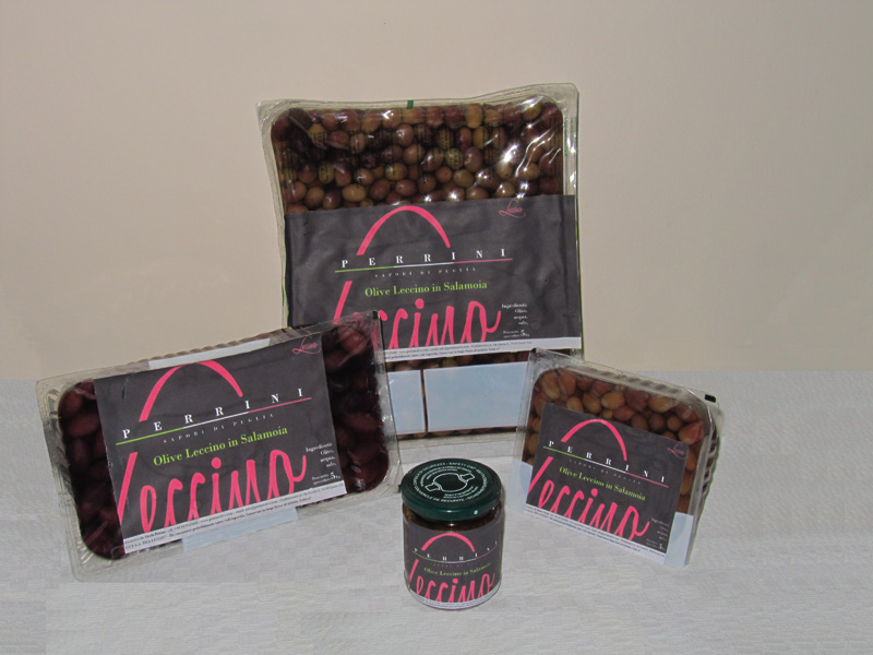 PERRINI seleziona le migliori olive della varietà Leccino per la lavorazione da tavola e messa in salamoia (Metodo Riviera). Le olive, raccolte tramite brucatura pneumatica e manuale da metà ottobre a inizio dicembre, sono subito defogliate, calibrate e selezionate, lavate e quindi immerse in una delicata salamoia composta unicamente di acqua e sale (al 10%), come la centenaria tradizione suggerisce. Al termine del naturale processo fermentativo acido-lattico in fusti da 140Kg, dopo i dovuti controlli ed analisi di acidità, di salinità, i rabbocchi di acqua e sale, il prodotto è disponibile in fusti da 140Kg, secchielli da 5Kg o 12Kg, o altre confezioni (vaschette di plastica da 400g, 1Kg, 2,5Kg, vasi di vetro da 1Kg).